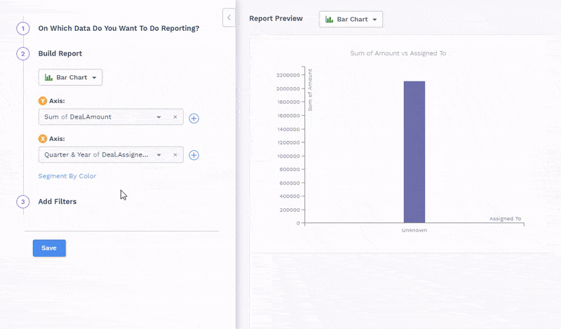 You need to choose whether you want to do reporting on contacts, companies, deals or something else.